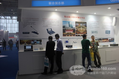 与之前的一些展会一样,台电在展台搭建方面同样是半园式的开放形式,顶部以台电logo为中心,展示了公司产品应用的一些重要场合的图片。下面的产品展示分为联合国工程技术展示区和其他产品展示区,分别展示了为联合国工程定制的一些产品和其他具有代表性的产品。包括HCS-48U7系列、HCS-48U8系列、HCS-48U9系列、HCS-8301M数字调音台、HCS-1030U电子名牌及HCS-8300MX/F多译员间管理系统。