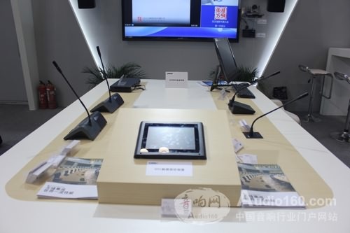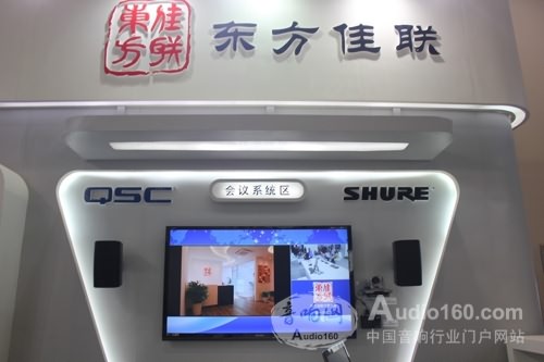 展位中心位置是会议系统解决方案区域。随着科技的发展、用户需求的提升,特别是IT技术的普及和应用,会议系统已逐步完成了由模拟化系统向数字化系统的转变,近年来更是有着向集成化、平台化发展的趋势,这也是会议系统发展的必然方向。北京东方佳联影视技术有限公司经过国内多个大型国际会议中心项目的经验积累,逐步整合了公司旗下的舒尔DIS数字化会议讨论系统、美国QSC Q-Sys网络音频处理平台以及SVSI分布式网络视频系统,形成一套完整的满足各种类型会议应用的音、视频及控制综合平台。
