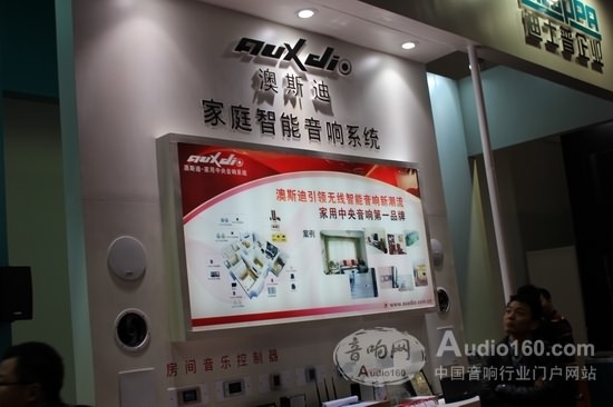 首次参展,澳斯迪的展位并不大,在36平米的展位上,Auxdio澳斯迪向广大的参展客户展示了多款家庭智能音响系统,包括:房间音量控制器、音视频同步系统、数字化系统、智能MINI主机系统等。澳斯迪展位延续了以往的风格,中间墙面“澳斯迪引领无线智能音响新潮流,家用中央音响第一品牌”的标题十分醒目,另外还有智能家居解决方案和应用实例的图片展会。其他部分以产品展示为主,各系列产品或摆放在桌面上或镶嵌在墙面上,整齐规划。