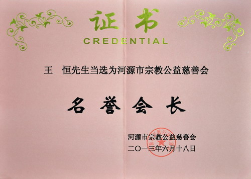 | 前言: 2013年6月18日,因对河源市宗教公益慈善会的贡献,王恒先生当选为河源市宗教公益慈善会名誉会长! |