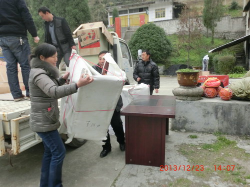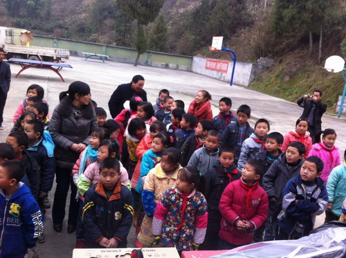 这次给学校捐赠了办公桌椅、电脑等办公设备;也给学生捐赠了和电子琴、跳绳、羽毛球拍、篮球等学习用品,由于山区冬天特别寒冷,特定为每个学生买一件棉衣过冬,孩子们穿上暖和的衣裳,高兴得欢呼起来:好暖和!