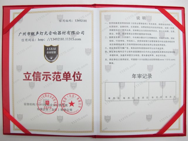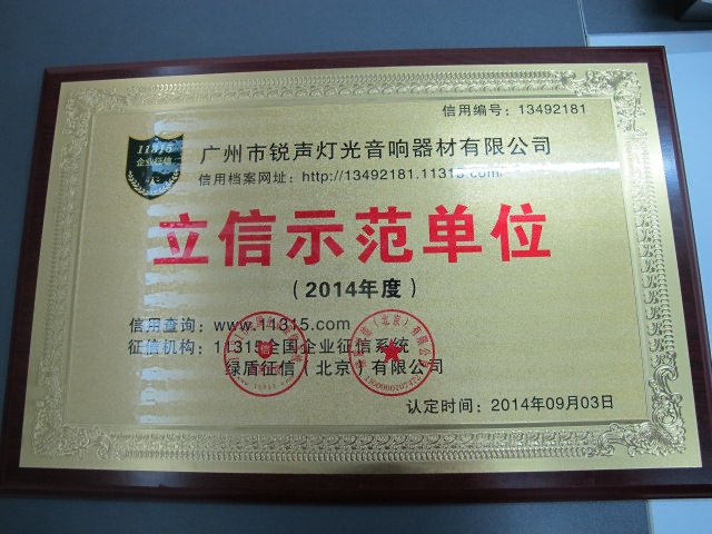广州市锐声灯光音响器材有限公司出席高峰会议并荣获广东省首批 “立信示范单位”荣誉称号。广州锐声成立于2005年,专门从事国际知名灯光音响产品营销,引进国际领先设计理念和系统解决方案,为共享世界专业品质而坚持不懈。锐声是行业出色的集产品推广、设计、销售及专业咨询、工程安装、调试等一站式服务的系统方案解决专家,公司一直坚持诚信是企业之本,本次有幸成为广东省首批立信示范单位,有赖于锐声全体员工的不懈努力,我们将会贯彻落实、推动、发展、实施广东省社会信用体系建设,让守信者更快健康发展,让失信者寸步难行;协助有关部门建立健全褒扬守信、失信惩戒机制,保障我省的社会稳定、经济快速发展。