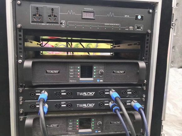 其中在舞台左右两侧分别吊挂着8只为一组的Vera36作为主扩声,4只为一组的Vera36作为侧补,一共应用了24只VERA36垂直线阵列,低音补充采用合计8只S33心形指向性超低音搭配2只BSX 双21寸超低分布在舞台两边,除此之外还有6只B30超低。由于舞台分为两部分,所以8只M12被均匀地布置在舞台上作为返送,4只T24作为前补。功放系统采用与TWAUDiO相搭配的K3DSP数字功放以及PLM12K44 4通道数字功放。